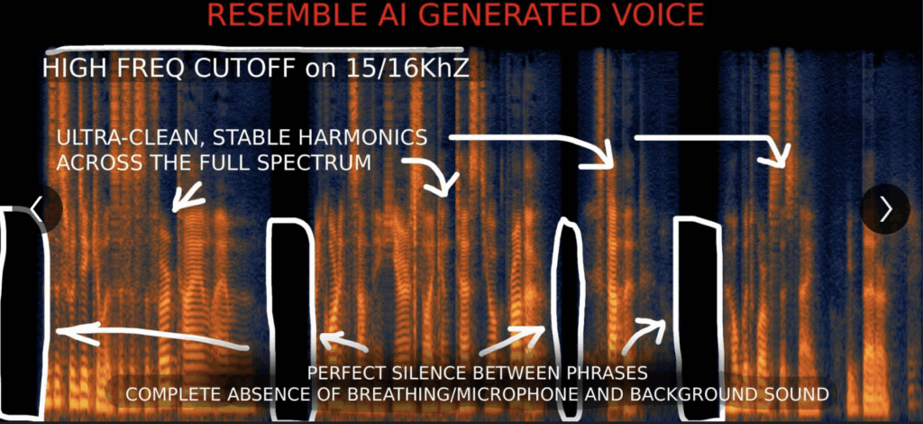 👉 Resemble AI: Wave-like bending in the voice during sound transitions—their signature “wavy” pattern.