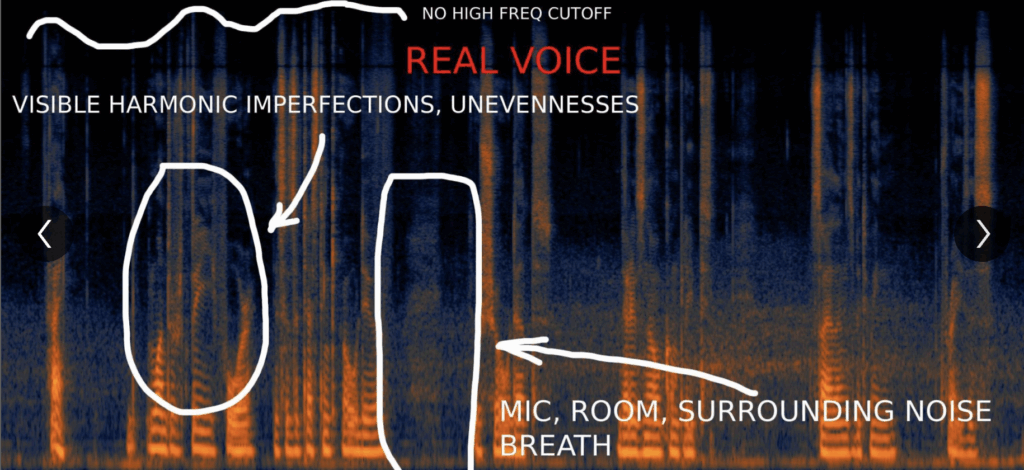 👉Background consistency – Check the spaces between phrases. Real recordings are full of room tone, microphone noise, tiny ambient sounds. The synthetic ones are just uniform “haze” or complete silence.